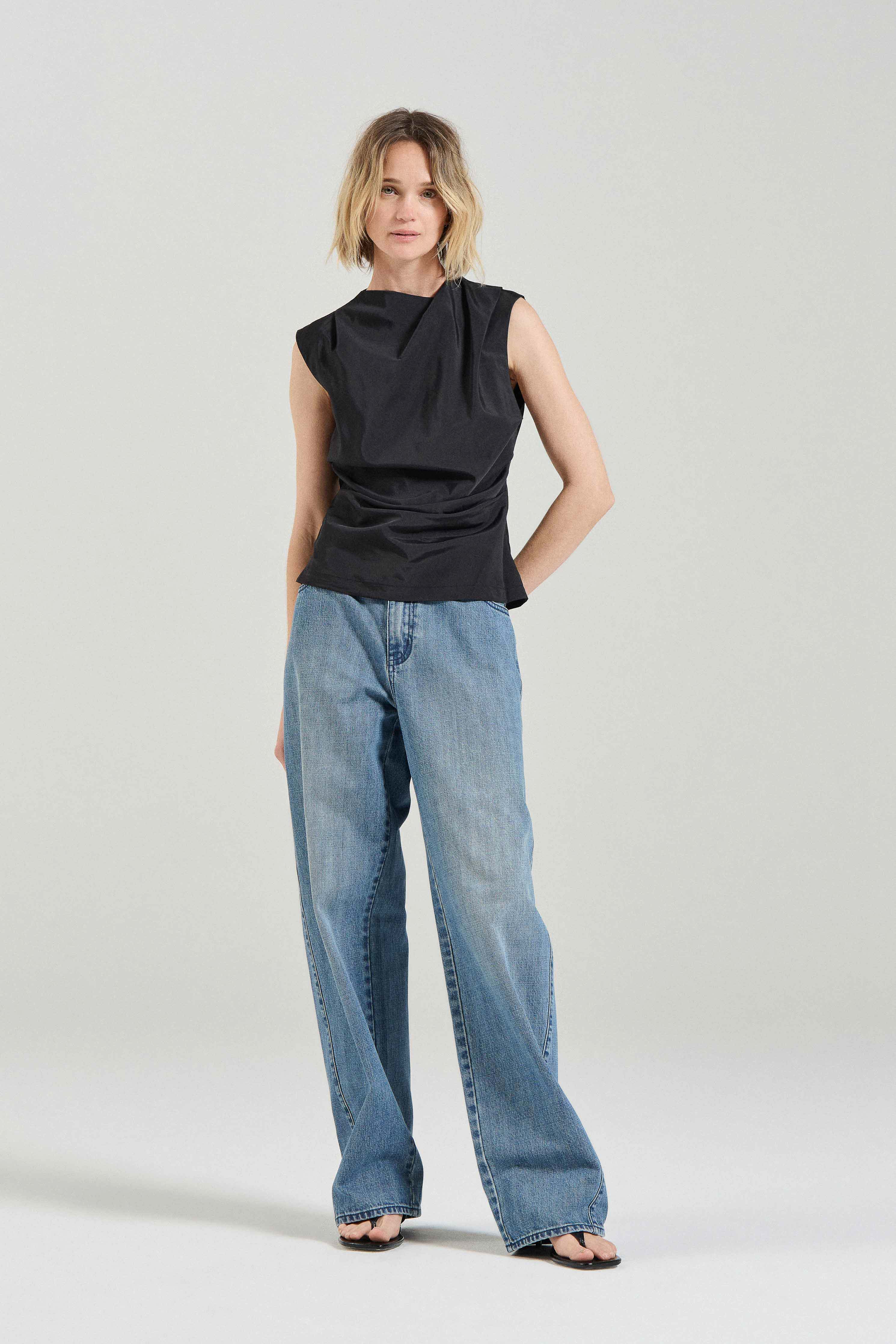 The Dylan Top is a hardworking piece that you can pull out for just about any occasion. Style with trousers for work, dress down with denim on the weekend, or elevate with a silk skirt and mules for an event. Crafted from a lightweight 100% recycled nylon, this piece features a high neck with practical back and side zippers. Thoughtful ruching and pleat detailing add texture and shape through the body.Â