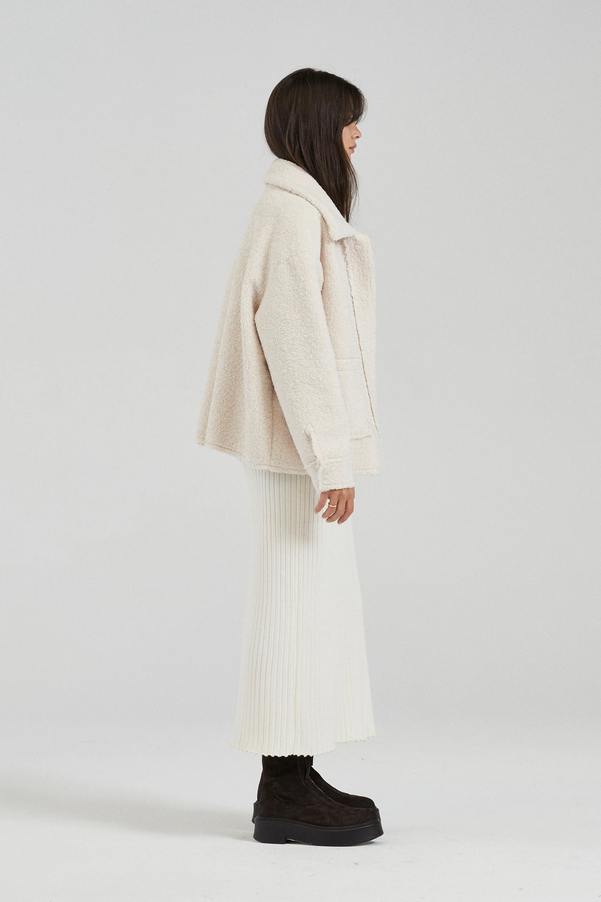 The Mimi Jacket is a sherpa-inspired style, impeccably crafted from a weighted, plush white faux shearling that feels just like the real thing. Featuring a soft beige faux suede on the reverse side, this piece is designed to be fully reversible for ultimate wearability and multifunctionality. This transseasonal essential is completed with two patch pockets on either side, trim detail and snap button fastenings to close.
